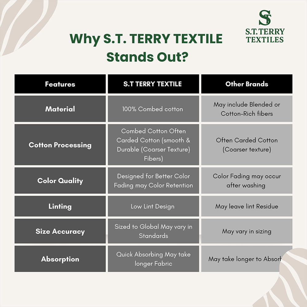 At ST Terry Textiles, we are committed to delivering export-quality towels crafted with care and attention to detail. Our focus on quality materials and reliable manufacturing ensures comfort, durability, and satisfaction in every product.